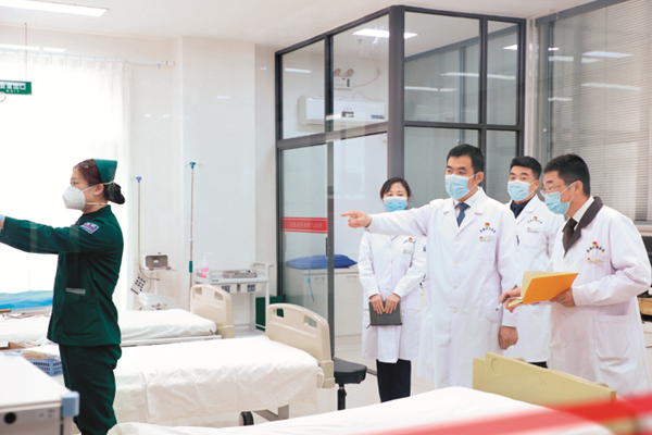 Thanks to Zhang Bing's tireless eforts, Fuxin Hospital established the Emergency Center, Stroke Center, Wound Trauma Center, and Endoscopy Center in the irst quarter of this year alone. Such settings enabled Fuxin Hospital to maintain an industry-leading success rate for emergency treatment in the city despite the ivefold increase in patients' volume at the peak of the pandemic. After the rehabilitation ward was established, it was even more diicult to ind an available bed, with the bed utilization rate of 116% in the month.