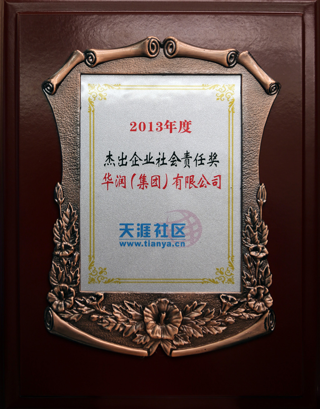 On December 6, the High-end Marketing Forum of the Community for 2013 was hosted by Tianya Community (www.tianya.cn) in Sanya, Hainan Province. At the forum, awards were granted to enterprises with outstanding performances in business management and corporate social responsibilities during the year. CR was awarded the Outstanding Corporate Social Responsibility Award for 2013, in recognition of the efforts of the Group in performing its corporate social responsibilities.