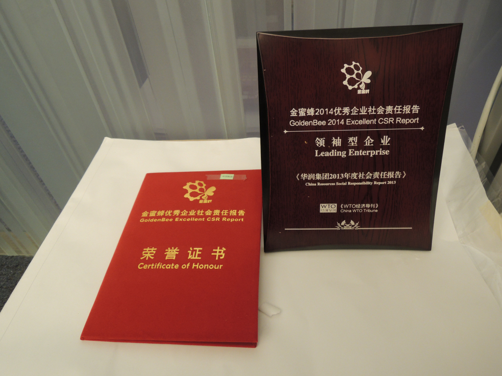 On December 3, the 7th China International Symposium on Corporate Social Responsibility Reports, hosted by WTO Tribune and other agencies was held in Beijing, at which the list of Leading Enterprises for Golden Bee 2014 Excellent CSR Reports were announced, with CR granted the top award as a leading enterprise, elected from among 2240 enterprises submitting their CSR reports. Golden Bee CSR Report Awards, including awards for leading enterprises, special awards and evergreen awards, are most influential and authoritative in the industry, annually elected by experts following the international standard based on published CSR reports. A total of 53 enterprises were picked out for the awards. Reports winning the awards for leading enterprises are considered as completely disclosing the philosophy, practices, results and representative cases of CSR performance of the enterprises, fully reflecting the characteristics of the industry and the enterprises, providing good reading experience, and thus considered representing the highest level of the reports. The symposium attracted more than 300 representatives from government agencies, enterprises, trade associations, research institutions and news media, who discussed key issues related to the standards, tendencies, compilation, assessment, communication and application of CSR reports as well as the disclosure of social responsibilities of overseas Chinese investment enterprises. Invited by the organizer, a representative from CR gave a speech at the symposium, sharing its experience in compiling the report and comments on how to prepare good CSR reports.