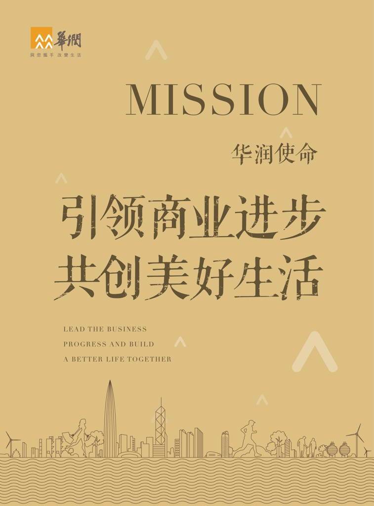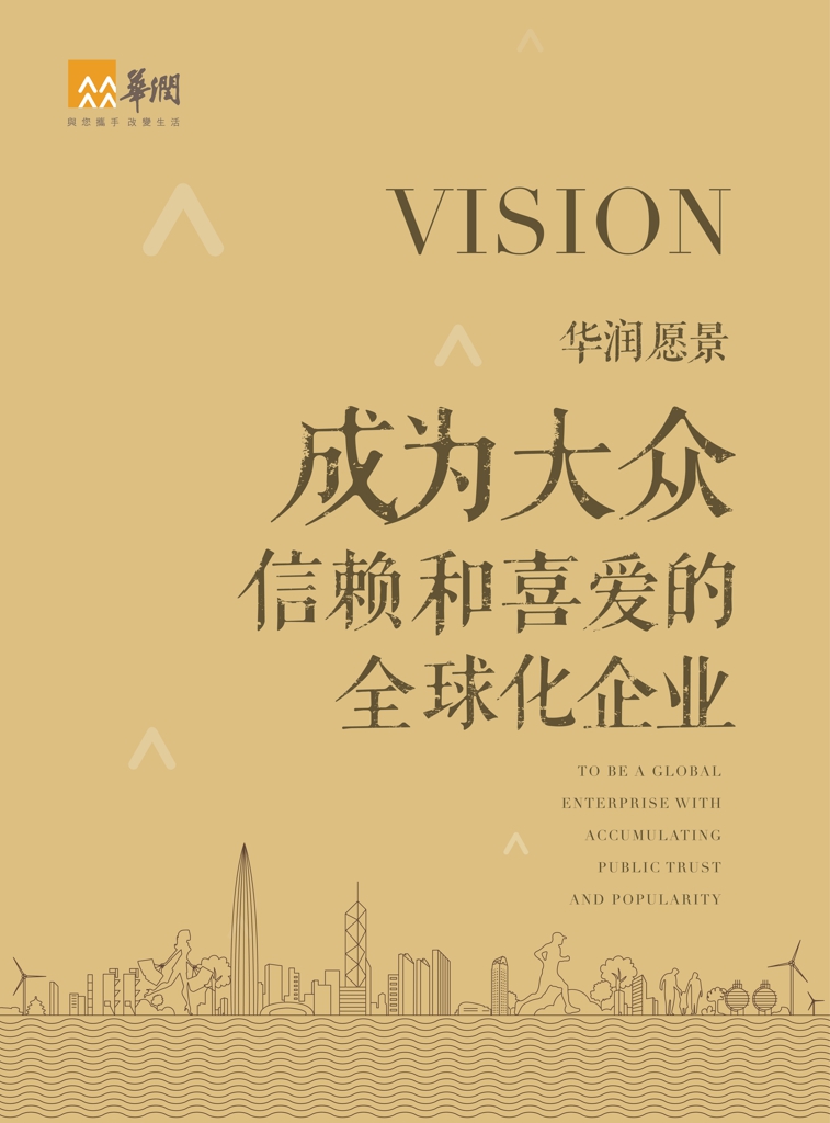 The new China Resources corporate culture system comprises five key elements: mission, vision, values, development concept and corporate spirit. China Resources' mission is to drive business development to create a happy life together. Its vision is to become a widely trusted and beloved global company. Its values are honesty and integrity, results-oriented, people-focused and innovation-based development. Its development concept is to grow strong, solid and large for lasting success. Its corporate spirit is pragmatism, professionalism, synergy and dedication.