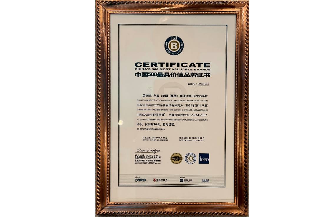 The "China's 500 Most Valuable Brands" list is compiled by the world's leading independent brand evaluation and marketing strategy consulting agency World Brand Lab. The list examines brand value based on three indicators: financial data, brand strength and consumer behavior analysis, and evaluates brand values according to the "present value of earnings” method. Known as the most authoritative and influential brand researcher in China, the award earns a reputation of being the Oscar of the Chinese brand. The inclusion of “China Resources” brand testifies to its strong influence. The improvement in brand value has also laid an even stronger foundation for the protection of “China Resources” trademark and brand name.