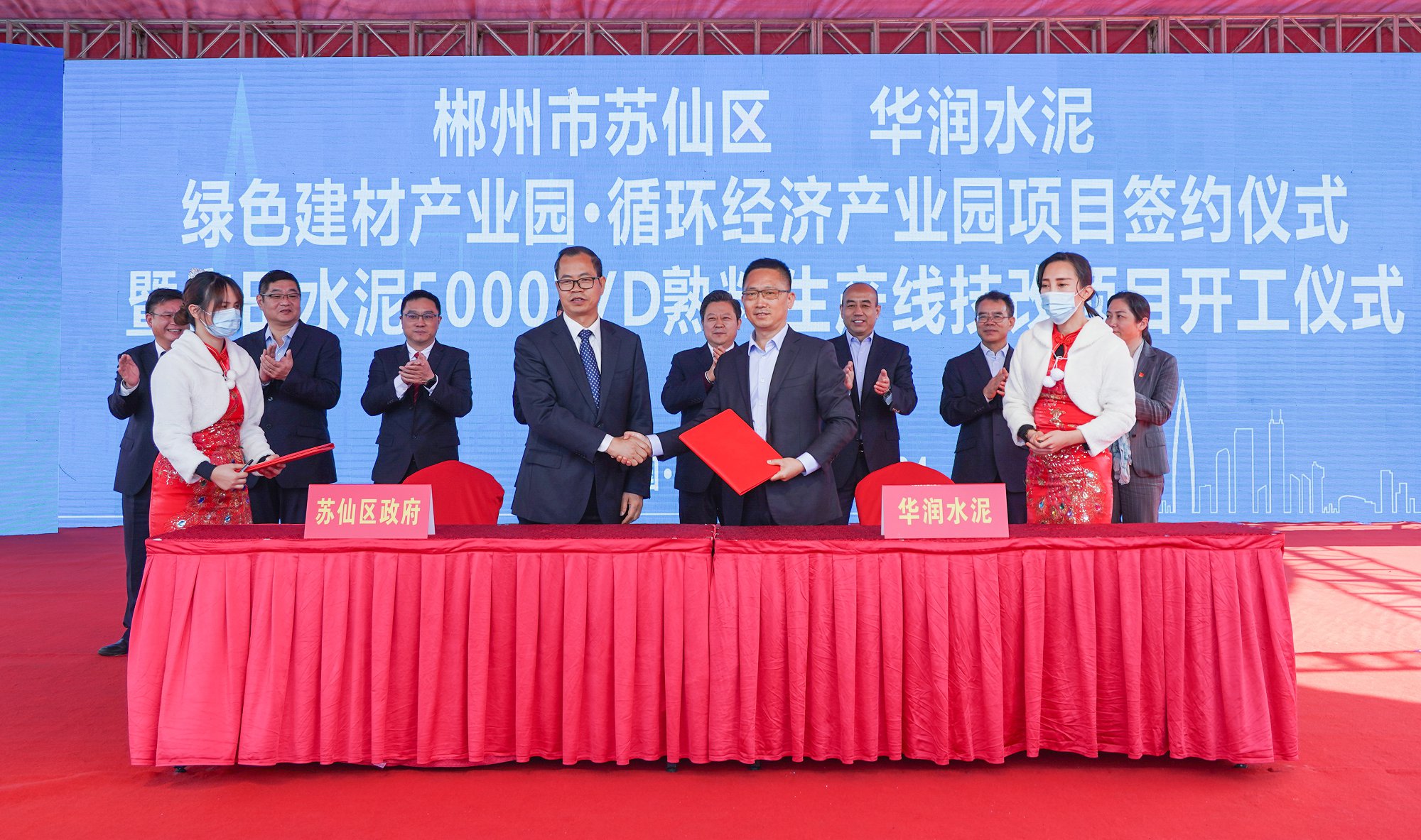 On December 24, CR Cement and the People’s Government of Suxian District, Chenzhou City, Hunan Province held a signing ceremony for Suxian District Green Building Materials Industrial Park and Circular Economy Industrial Park and a groundbreaking ceremony for the technical improvement project of Liangtian Cement’s clinker production line with a daily capacity of 5,000 tons, at Liangtian Cement Plant. Liu Zhiren, Secretary of Chenzhou Municipal Committee, Wu Jupei, Deputy Secretary of Chenzhou Municipal Committee and Acting Mayor of Chenzhou, Li Fuli, Vice General Manager of CR and Chairman of the Board of Directors of CR Cement, and relevant responsible persons of CR Cement attended the ceremony and witnessed the signing of the project between the two parties.