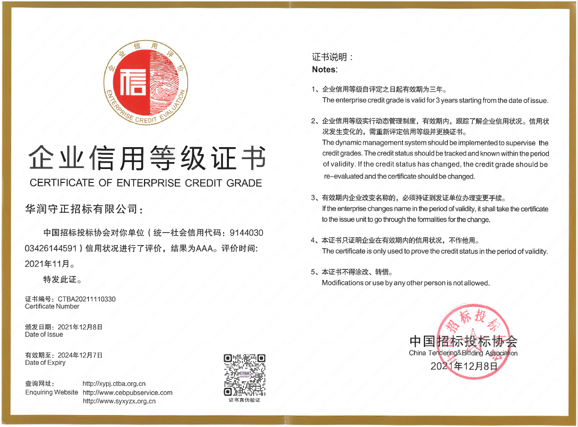 Recently, CR Shouzheng Tendering Limited (“Shouzheng”) was awarded the AAA Credit Enterprise Certificate by China Tendering & Bidding Association (CTBA). The credit rating is a crucial effort of CTBA to implement the Guiding Opinions of the General Office of the State Council on Accelerating the Construction of a Social Credit System and Constructing a New Credit-based Supervision Mechanism and the Comprehensive Supervision by Trade Associations and Chambers of Commerce (Trial) issued by the National Development and Reform Commission and other nine departments, advance the construction of credit system in the tendering & bidding industry and improve the mechanism on rewards and punishments for keeping and breaching credits of tendering & bidding companies.