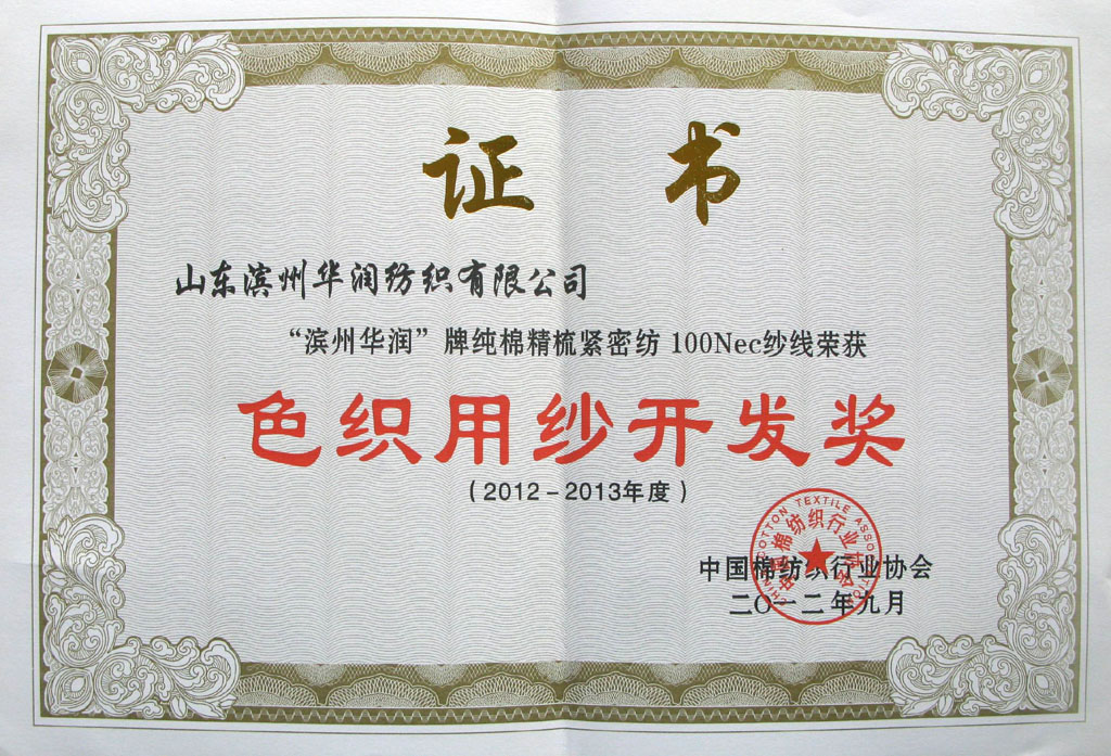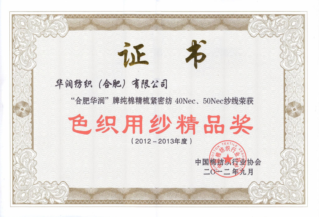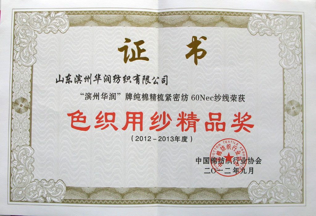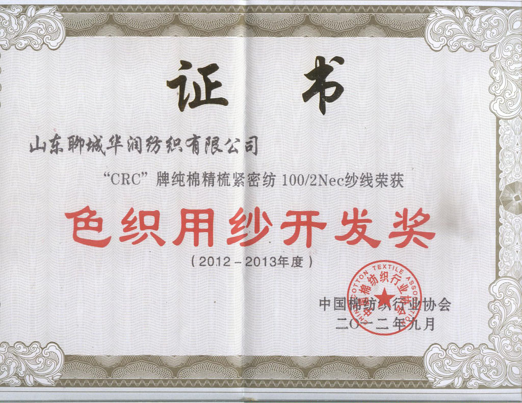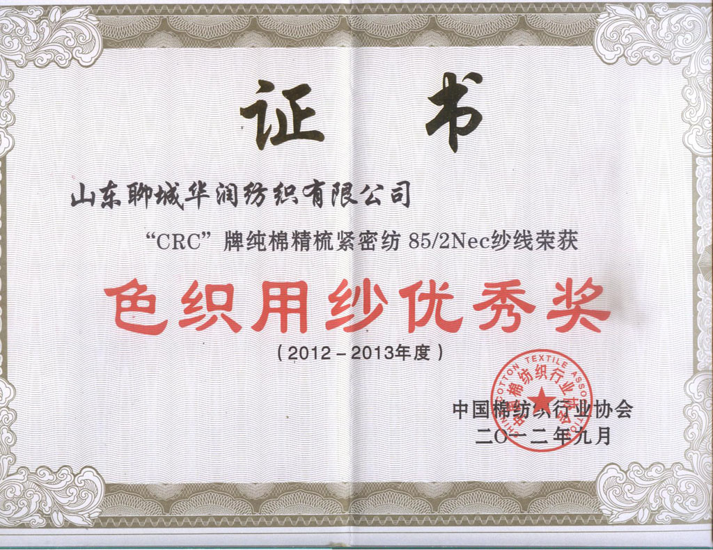 In spite of the fluctuation of price of raw cotton, CR Textile guarantees the quality of its high count yarn products by adjustment to, transformation of its business and by promoting lean management. In this rating, NE60/1 compact spun yarn produced by CR Textile (Binzhou) and NE50/1 and NE40/1 compact spun yarn produced by CR Textile (Hefei) won the award for boutique dyed yarn products; NE100/2 compact spun yarn products produced by CR Textile (Liaocheng) and CR Textile (Binzhou) won the award for new developments in dyed yarn products and NE85/2 compact spun yarn produced by CER Textile (Liaocheng), NE80/1 and NE70/1 produced by CR Textile (Binzhou) won the Award for performance excellence for compact spun yarn products.