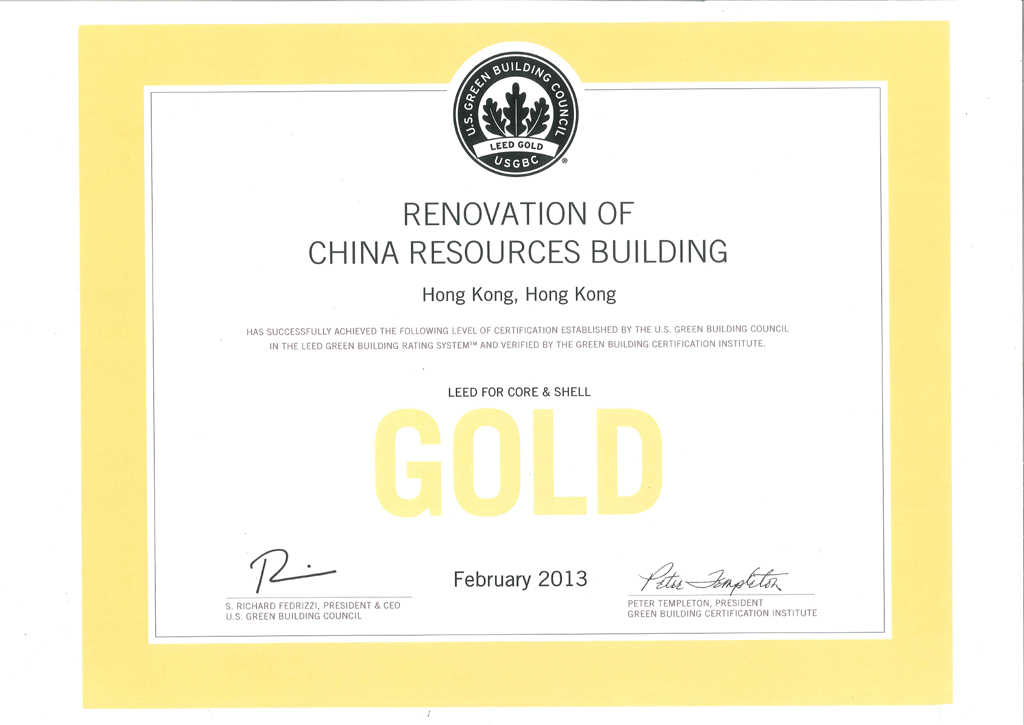China Resources Building Renovation Project has passed the annual process audit since it is pre-qualified for the candidacy of LEED Gold Award since 2010 and now has been formally certified, marking that the renovation project has reached the advanced international standard.