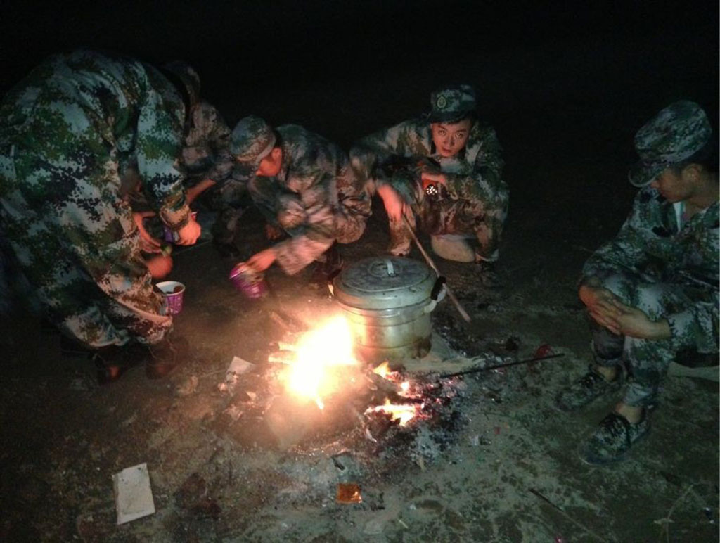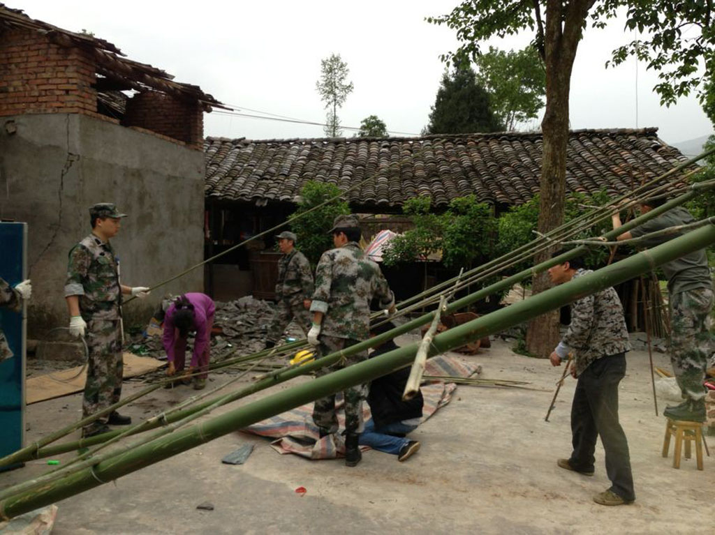 Braving the road blockage, loose rocks and landslides, the rescue team arrived at Longmen Township, Lushan County, the epicenter, at 4:30 on the same day. The rescue team immediately started rescue work, eliminating hazards and rescuing properties, under the command of the directing authority. In the evening, the rescue team camped on a dry riverbed with the task of guarding the barrier lake. At 6:00 on the morning of April 20, the team reached Gucheng Village in the mountain on foot, comforting the victims while performing their rescuing tasks.