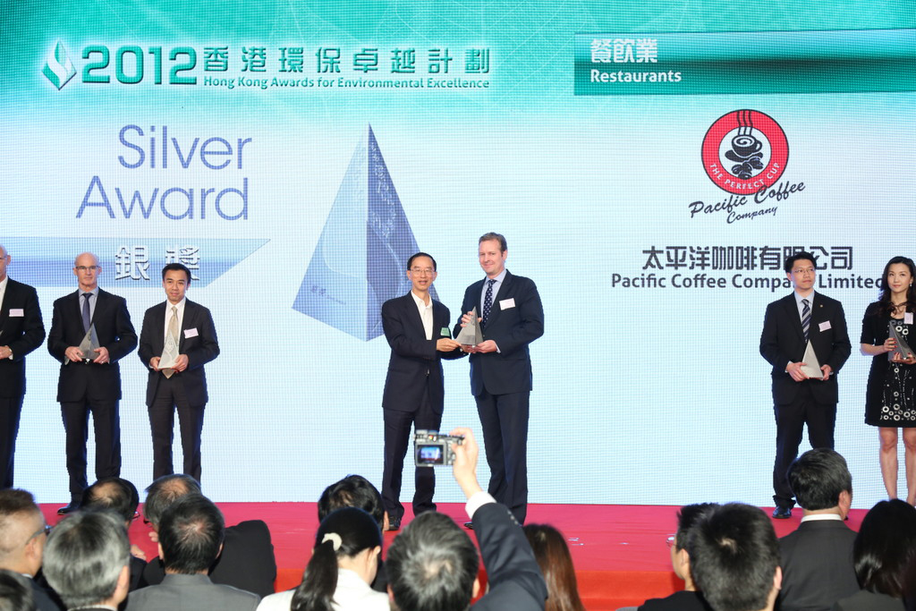 On May 15, the awarding ceremony for 2012 Hong Kong Awards for Environmental Excellence was in Hong Kong, officiated by Leung Chunying, Chief Executive of HKSAR. The ceremony involved officials from the government of HKSAR, representatives from industrial and business circles of Hong Kong and heads of environment agencies in Macao, Guangzhou and Shenzhen. At the awarding ceremony, Pacific Coffee Emporium, the flagship store of Pacific Coffee in Hong Kong was selected from among 776 candidate businesses for the silver award of 2012 Hong Kong Awards for Environmental Excellence, the first of the kind awarded to coffee retail businesses for the design and operational philosophy featuring low-carbon and environment protection.