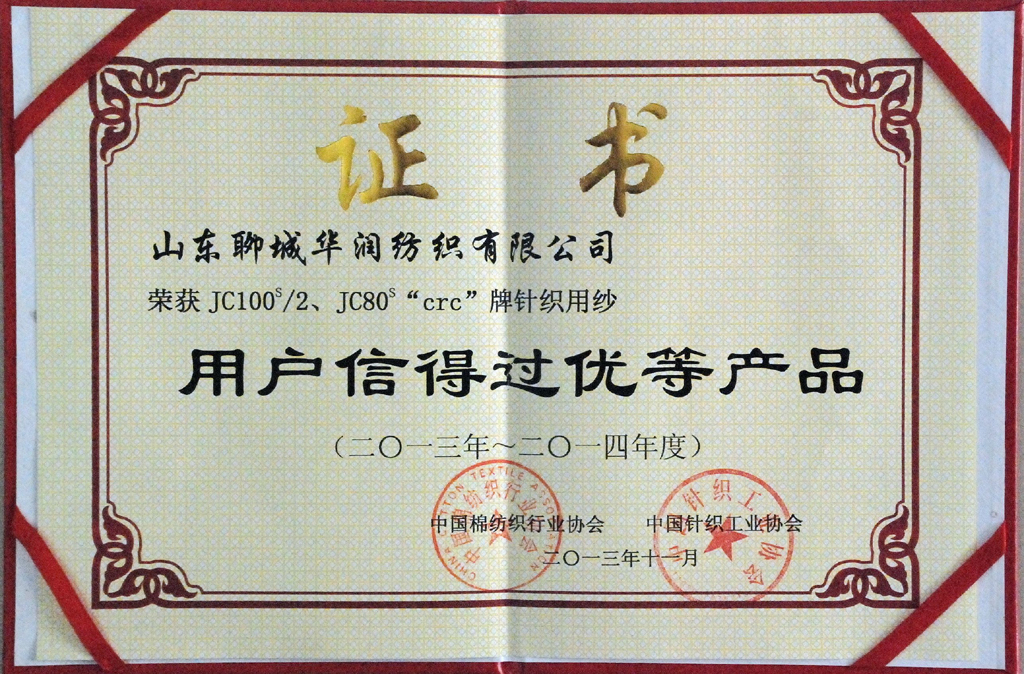 Recently, compactly spanned single-strand and double-strand pure cotton yarn NE80 and NE100, respectively, produced by CR (Liaocheng), a high-count yarn production base of CR Textile, won the title “Excellent User-trusted Products for Knitting Yarns for 2013-2014, co-granted by China Textile Industry Association and China Knitting Industry Association. The title, granted on the basis of test and appraisal according to the 11 standard criteria for knitting yarns and four special requirement criteria for yarn quality, is the highest honor in the textile industry of China in this year.