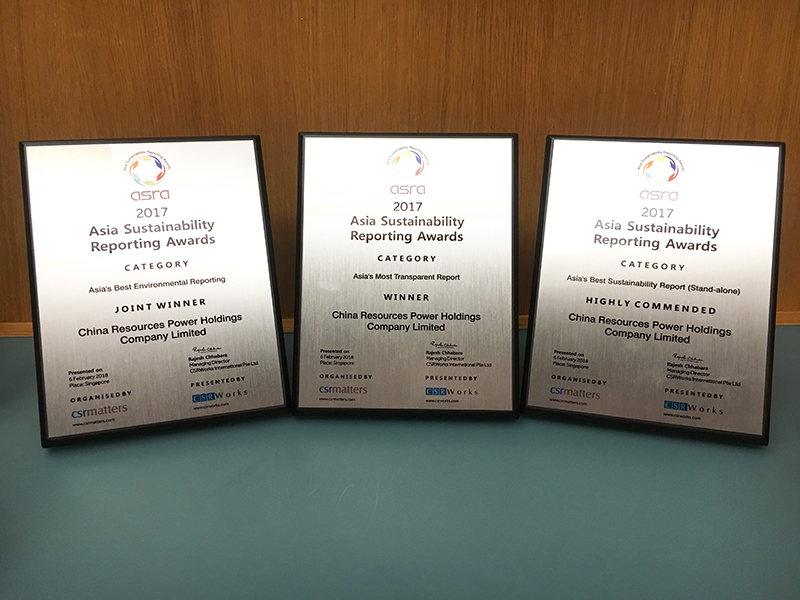 On February 6, 2018, China Resources Power (CR Power) was given the Award for Best Environment Report in Asia, the Award for Most Transparent Report in Asia and the Award for Best Sustainable Development Report in Asia as CSRWorks, an Asia-based social responsibility authority, unveiled the 2017 Asian Sustainable Development Report Awards in Singapore. CR Power beat hundreds of competing companies to win these awards.